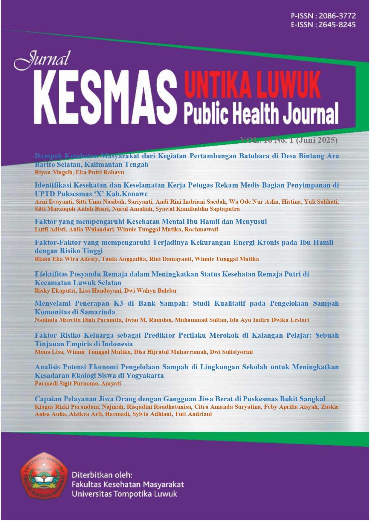 Students' awareness of waste management is still low, even though students play an important role as agents of change in the school environment. The aim of this research is to determine the relationship between knowledge about waste management, the economic potential of waste management, and student participation in waste management with students' ecological awareness at MA Nurul Ummah Yogyakarta. The type of this research is quantitative descriptive. The design in this research is cross-sectional. The research subjects were 30 students selected based on purposive sampling technique. The instrument in this research is a questionnaire. Data analysis in this study was carried out using the Chi-Square test. The independent variables in this research are knowledge about waste management, the economic potential of waste management and student participation in waste management. The dependent variable is students' ecological awareness. The results of research data analysis show that there is no significant relationship between knowledge about waste management and students' ecological awareness (p=0.337), and there is no relationship between students' participation in waste management and students' ecological awareness (p=0.552). However, there is a significant relationship between the economic potential of waste management and students' ecological awareness (p=0.035). Conclusion: There is a significant relationship between the economic potential in waste management and students' ecological awareness. There is no relationship between knowledge about waste management and student participation in waste management with students' ecological awareness at MA Nurul Ummah Yogyakarta.